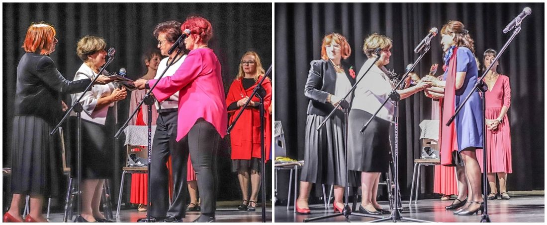 Rozpoczęły się występy zaproszonych gości oraz naszych zespołów. Jak barwne ptaki na scenie występowały zespoły śpiewające na zmianę z tańczącymi.