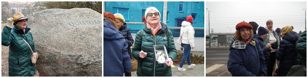 Ela przy pamiątkowym głazie . Lodzia i pamiątkowe krokusy. Janka, jak i wszyscy z krokusami w klapie.