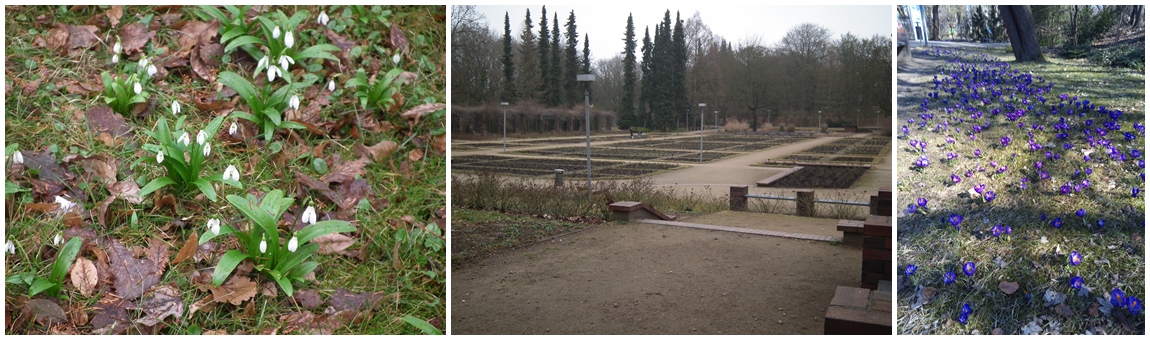 Idąc alejką wzdłuż pergoli z pnąca glicynią podziwialiśmy mnóstwo kępek przebiśniegów i pierwsze tegoroczne krokusy nieśmiało wyrastające z trawy.