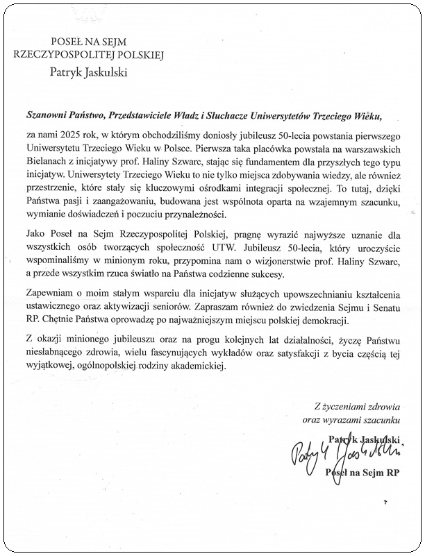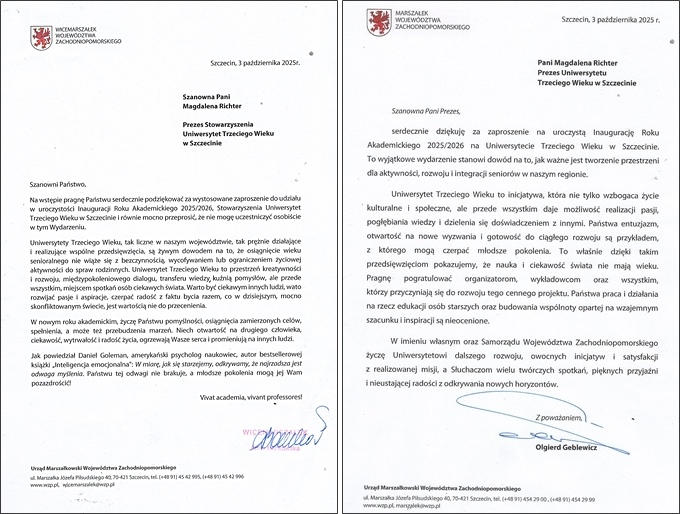 Studenci Stowarzyszenia Uniwersytet Trzeciego Wieku w Szczecinie rozpoczęli właśnie 48 rok akademicki. Uroczysta inauguracja odbyła się w auli WSB Merito w Szczecinie 3 października 2025 r, a rozpoczęła się odśpiewaniem hymnu – Gaude Mater Polonia przez Chór Kanon pod dyrekcją Pani Neli Urant.