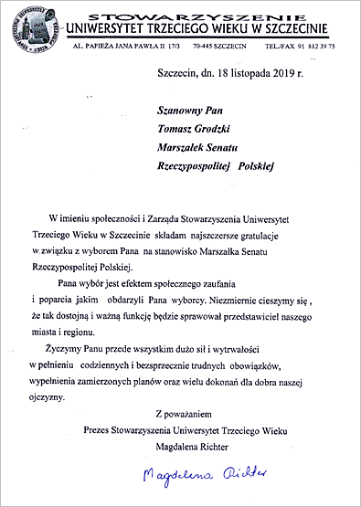 - 2.X.2019 r. w uroczystości 10-lecia Gryfińskiego Uniwersytetu Trzeciego Wieku , Zarząd i słuchaczy reprezentował Piotr Mojzykiewicz – członek Zarządu.