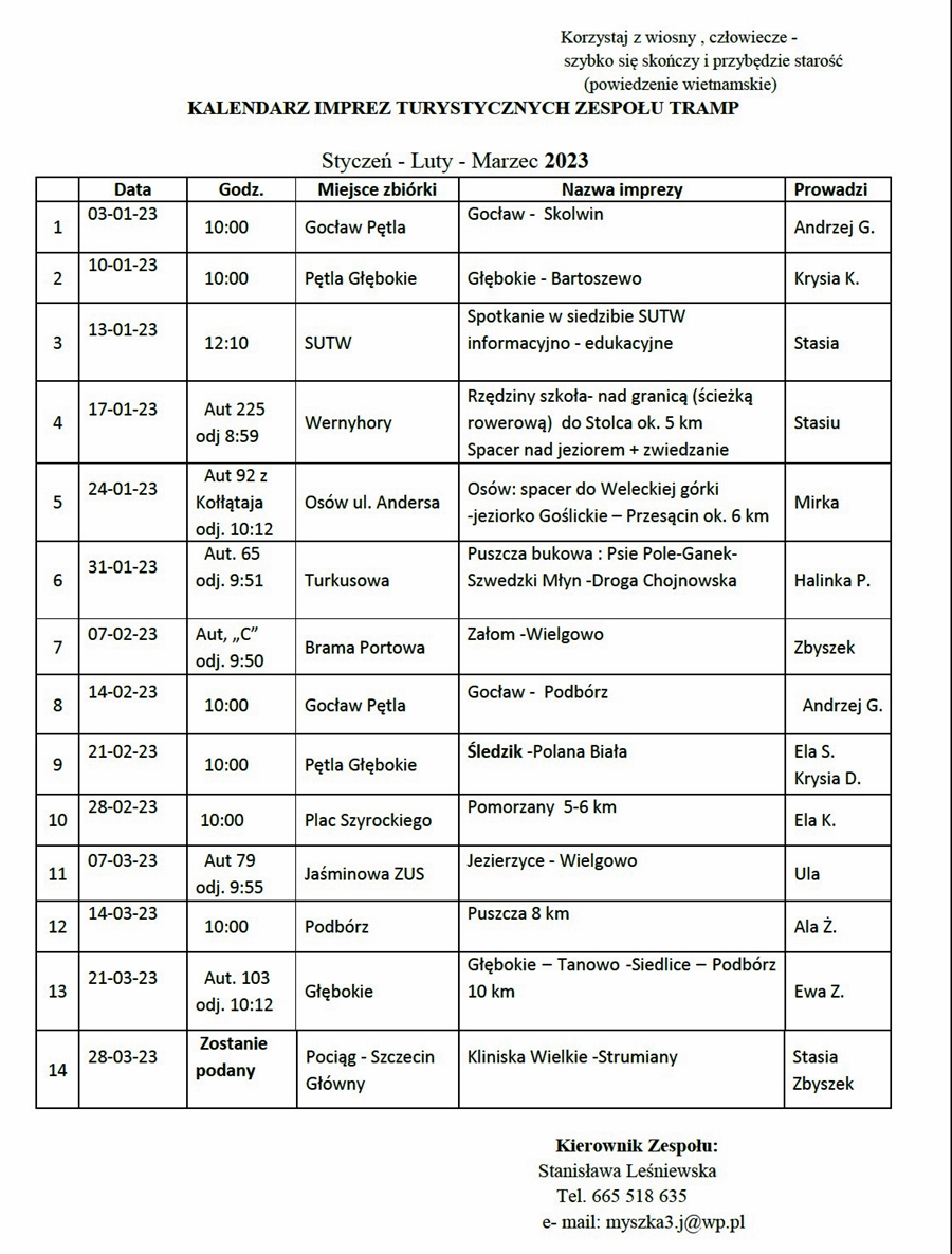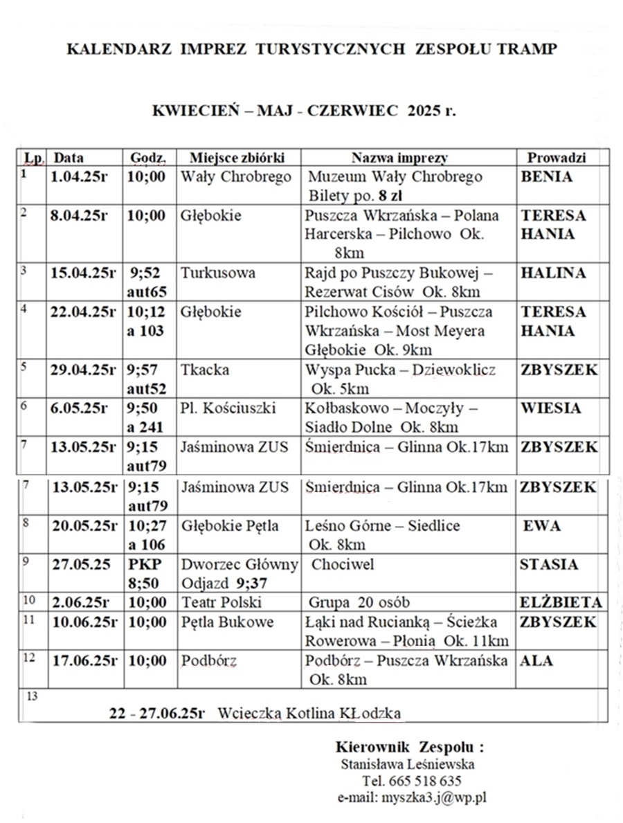 KALENDARZ IMPREZ TURYSTYCZNYCH ZESPOŁU TRAMP